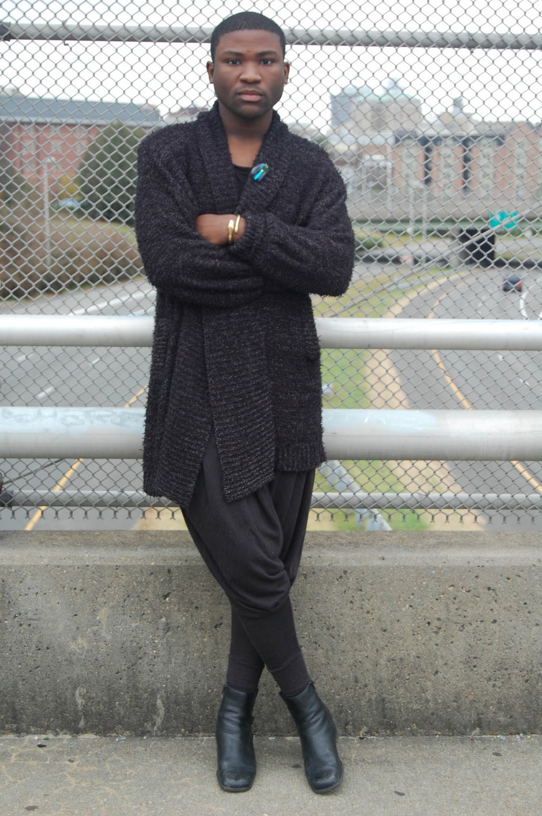("Cookie Monster" Cardigan: Vintage, Scarab Broach: RMG Collection, Tiger Clamp Bracelet: Vintage, Tee: American Apparel, Pants: Custom made for me by my friend Shanice, Rad Hourni Inspired Boots: Thrifted)